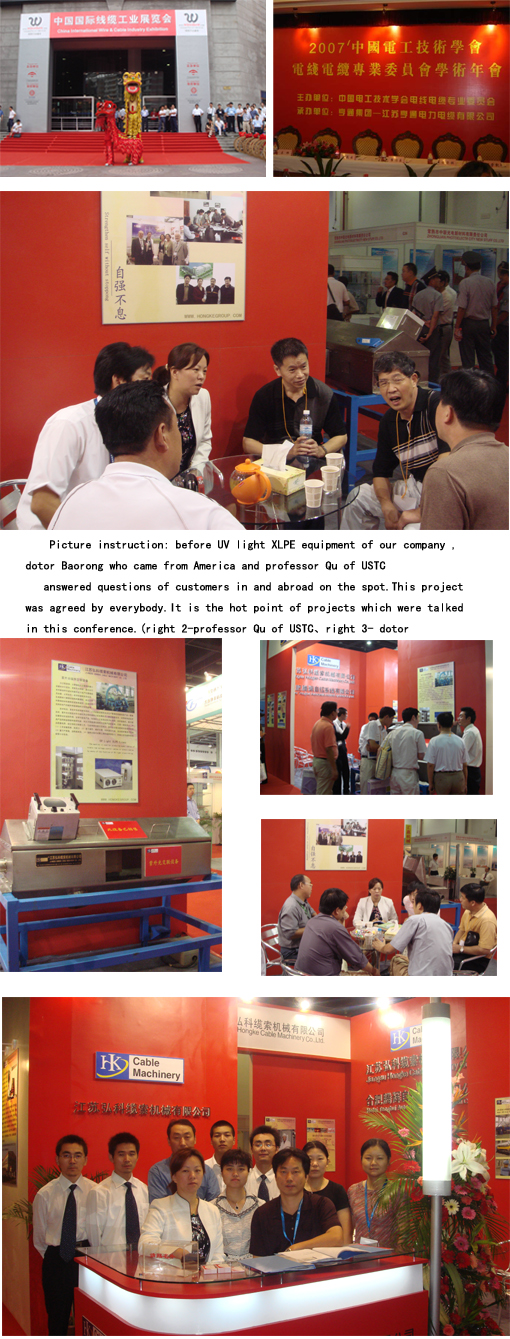 In a new feature ,our company received customers in and abroad and friends in the field of wire and cable warmly ,and gained plentiful harvest.To bring out our new product of UV light XLPE equipment better,our company showed the sample machine.Many customers were very interested in it. Customers in and abroad came to inquire and talk in an endless stream. Doctor Baorong who came from America and professor Qu of USTC answered questions of customers in and abroad on the spot.This project was agreed by everybody.It is the hot point of projects which were talked in this conference.